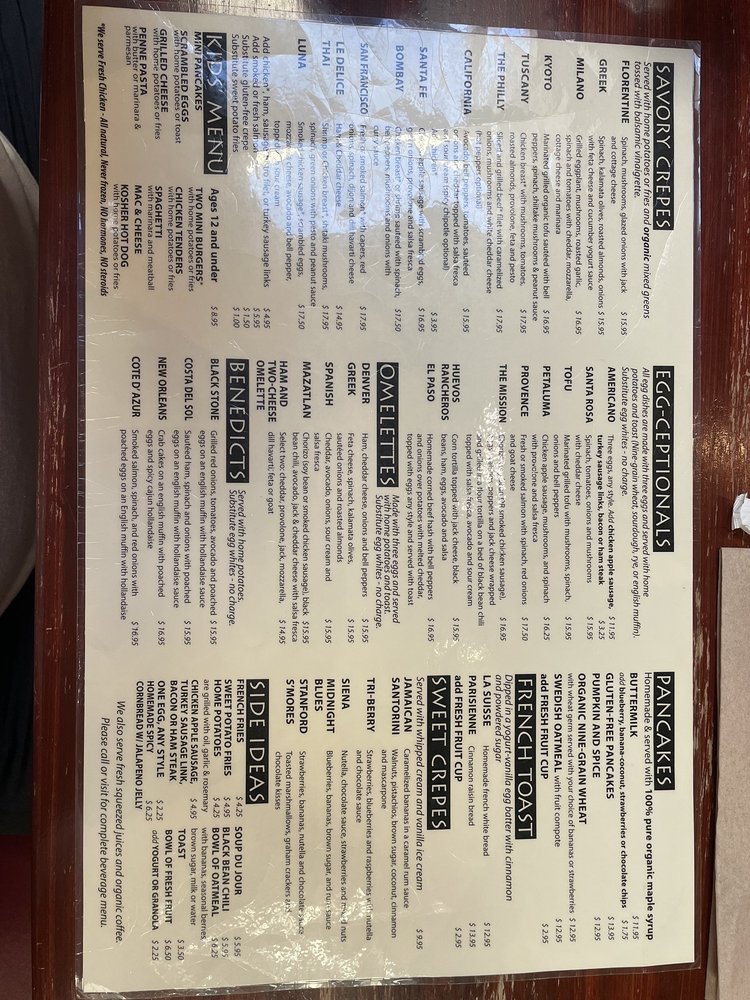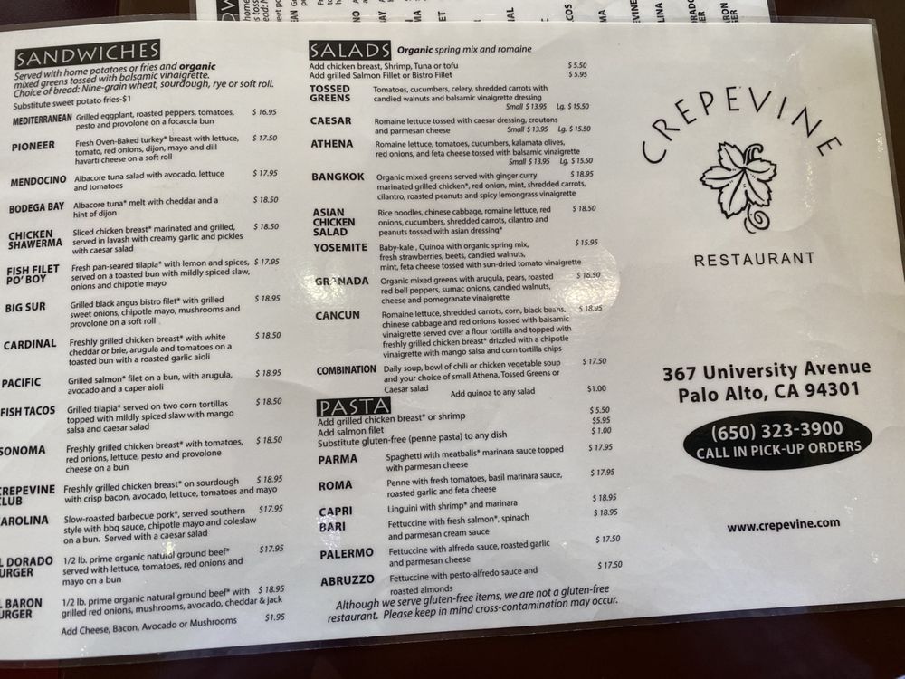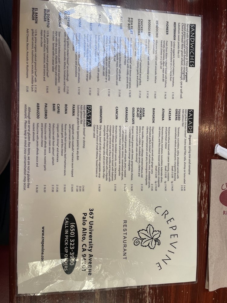 Crepevine Restaurants in Palo Alto offers a diverse menu of crepes, breakfast, brunch, and lunch options. Customers rave about the generous portion sizes and delicious food, with favorites like the Tuscany crepe, Luna crepe, and pesto fettuccine. The restaurant provides vegan and vegetarian options, gluten and dairy-free offerings, as well as special dishes not on the daily menu. The casual setting with outdoor seating and attentive staff make for a pleasant dining experience. Customers also appreciate the environmentally conscious practices, such as compostable containers and plastic-free packaging. Overall, Crepevine is a popular spot for flavorful dishes in a welcoming atmosphere with a range of options to satisfy various dietary preferences.